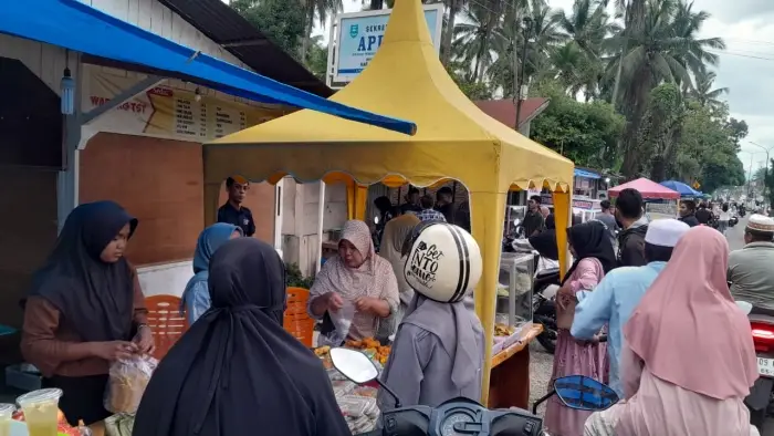 Kamis sore, 26 Februari 2026, persimpangan yang biasanya menjadi jalur lalu lintas biasa bertransformasi menjadi pusat energi ekonomi bagi warga Mandailing Natal (Madina). Sejak jarum jam menunjukkan pukul 16.00 WIB, kawasan ini telah bersolek dengan tenda-tenda berwarna cerah yang menjajakan aneka penganan berbuka puasa.