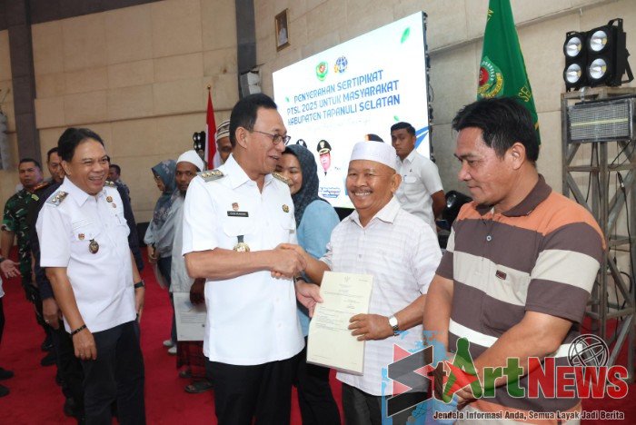 Tapsel, StartNews – Bupati Tapanuli Selatan (Tapsel) H. Gus Irawan Pasaribu menyerahkan 200 sertifikat tanah kepada masyarakat melalui program Pendaftaran Tanah Sistematis Lengkap (PTSL) tahun 2025 di Gedung Serba Guna Sarasi, Komplek Perkantoran Pemerintah Tapanuli Selatan, Jalan Prof. Lafran Pane, Sipirok, Rabu (8/10/2025).