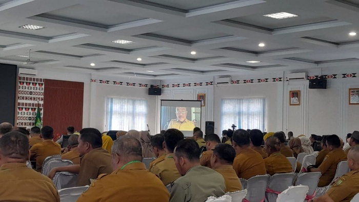 Bupati Madina H. Saipullah Nasution saat membuka Musrenbang Rencana Kerja Pemerintah Daerah (RKPD) Tahun 2027 secara virtual dari Aula Kantor Bupati, Senin (6/4/2026). (FOTO: STARTNEWS/FADLI MUSTAFID)