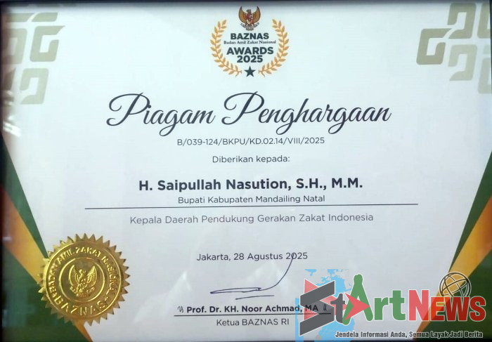 Panyabungan, StartNews – Badan Amil Zakat Nasional (Baznas) memberikan penghargaan kepada Bupati Mandailing Natal (Madina) H. Saipullah Nasution sebagai Kepala Daerah Pendukung Gerakan Zakat Indonesia.