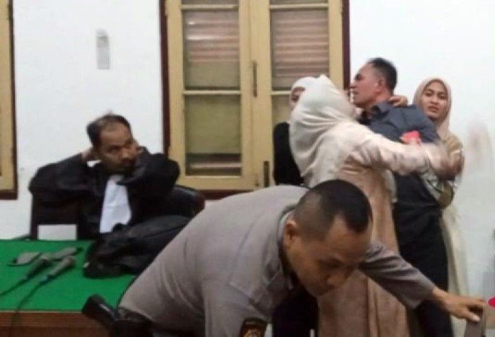 Istri dan dua putrinya yang turut hadir di ruang sidang berusaha menenangkannya sembari menangis dan memeluk erat terdakwa Ismail. “Ikhlas, Pak. Kita punya Allah, Pak. Sudah, Pak,” ucapnya.