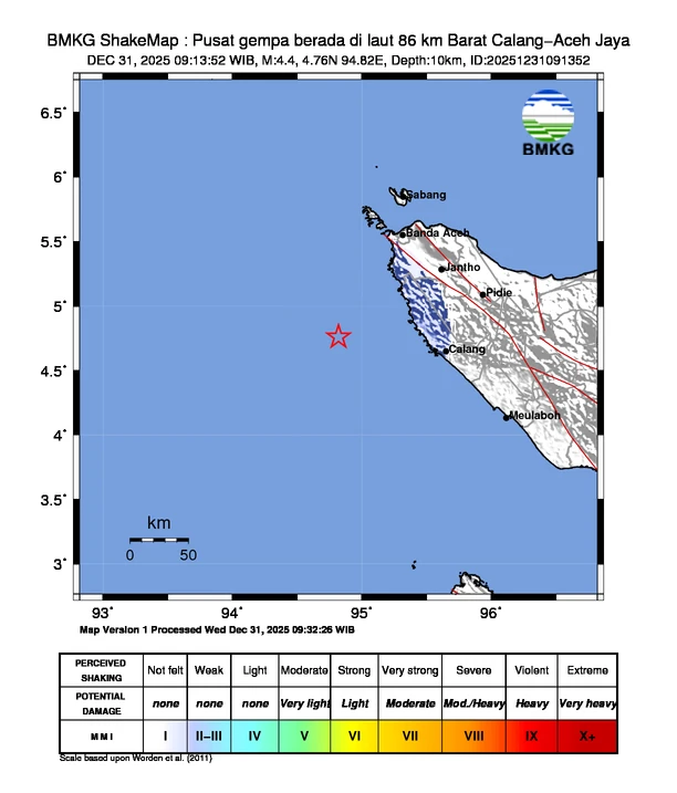 Aceh, StartNews – Badan Meteorologi, Klimatologi, dan Geofisika (BMKG) melaporkan peristiwa gempa bumi tektonik yang mengguncang wilayah Calang, Kabupaten Aceh Jaya pada Rabu (31/12/2025) pagi. Berdasarkan data resmi, gempa ini memiliki kekuatan Magnitudo 4,4.