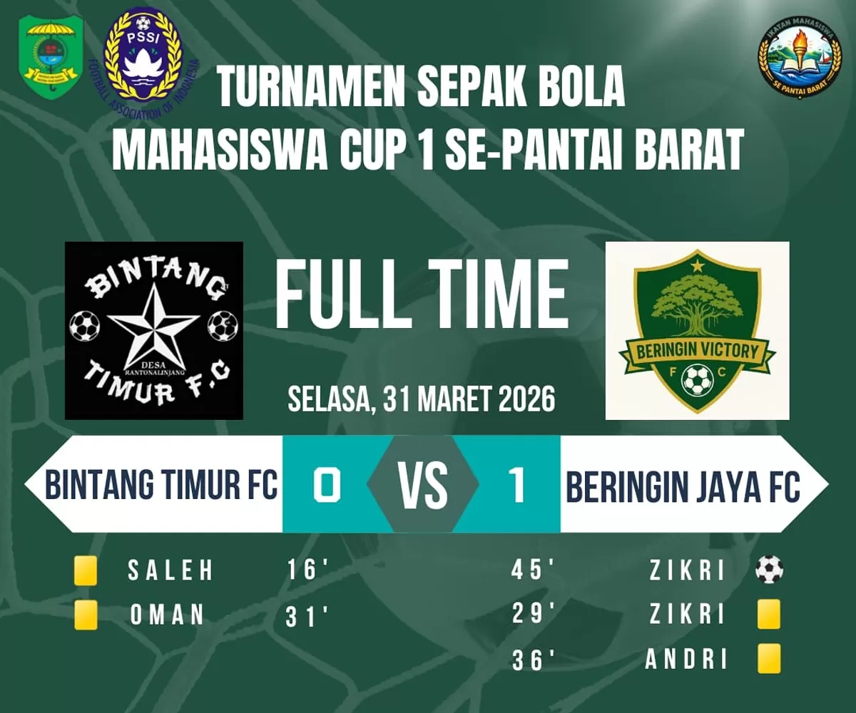 Panyabungan, StartNews – Beringin Jaya FC sukses menumbangkan Bintang Timur FC dengan skor tipis 1-0 dalam laga lanjutan Turnamen Sepak Bola Mahasiswa Cup I se-Pantai Barat yang digelar di Mandailing Natal pada Selasa (31/3/2026). Kemenangan ini menjadi modal penting bagi Beringin Jaya FC untuk mengamankan posisi mereka dan membuka peluang lebih besar melaju ke babak selanjutnya dalam turnamen bergengsi tersebut.