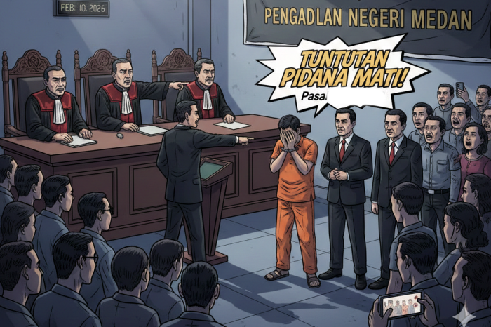 “Menuntut agar majelis hakim menjatuhkan pidana mati terhadap kedua terdakwa,” ujar JPU Achmad Yudha Prasetyo di hadapan majelis hakim di Ruang Sidang Cakra VII, Pengadilan Negeri Medan.