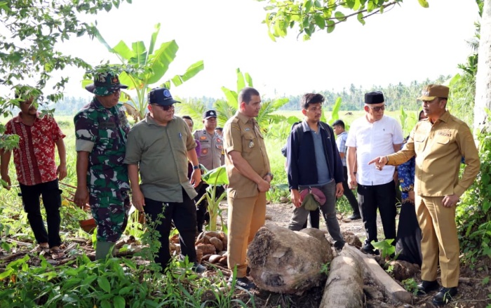 Bupati Madina H. Saipullah Nasution bersama Kepala Dinas Pertanian Madina Taufik Zulhendra Ritonga dan sejumlah pejabat meninjau lahan pertanian terdampak bencana di Nagajuang, Senin (27/4/2026). (FOTO: DISKOMINFO MADINA)