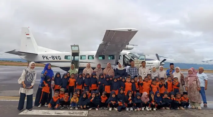 Meskipun wajah anak-anak tampak sedikit lelah setelah berkeliling, rona bangga terpancar jelas saat mereka berpose di samping pesawat bersama sang Wakil Bupati. Hari itu, para santri TK Islam Al-Husna tidak hanya belajar tentang cara pesawat terbang, tetapi juga tentang bagaimana cita-cita besar bisa dimulai dari tanah sendiri.