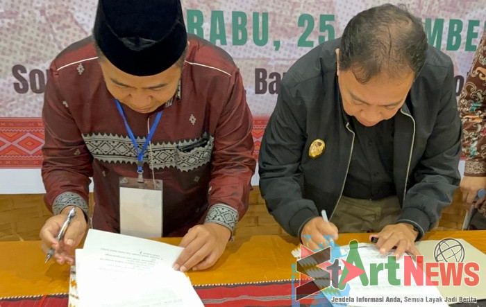 Menjelang penutupan, Ketua Umum Yayasan Tabagsel Institvte Ayub Suleman dan Wakil Bupati Tapsel H Jafar Syahbuddin Ritonga, melakukan penandatanganan serah terima rekomendasi lokakarya.