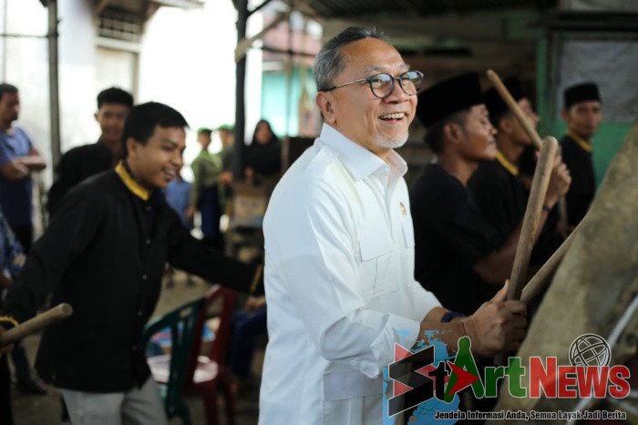 Momen hangat itu terjadi saat rombongan menteri bersiap meninggalkan salah satu lokasi kunjungan. Alih-alih langsung menuju kendaraan, pandangan Zulhas justru terpaku pada deretan gendang besar yang tersusun rapi. Dengan penuh antusias, dia menghampiri para seniman lokal.