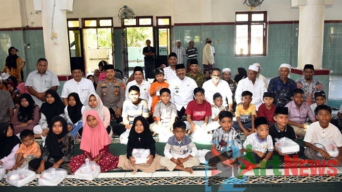 Bupati Madina H. Saipullah Nasution bersama anak-anak yatim di Masjid Raya Nurul Huda, Kelurahan Siabu, Kecamatan Siabu, Jumat (11/7/2025). (FOTO: DISKOMINFO MADINA)