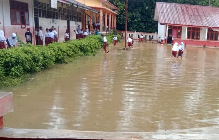 Air menggnenangi area SD Negeri 377 Transbandep Patiluban setelah wilayah itu diguyur hujan deras sejak Senin (9/6/2025) malam hingga Selasa (10/6/2025) pagi. Di halaman sekolah, genangan air hampir setinggi lutut anak SD.