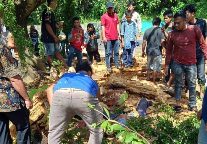 Salah seorang saksi mata menyebutkan kondisi korban sudah kritis saat dievakuasi dari bawah batang pohon yang melintang di badan jalan.
