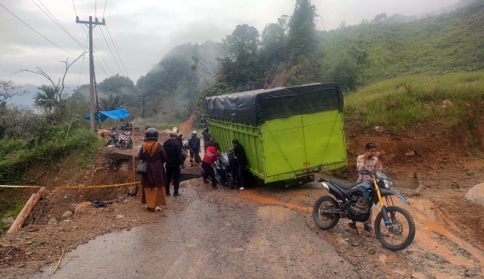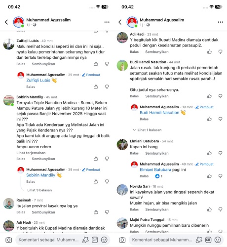 “Ternyata Triple Nasution Madina-Sumut belum mampu memperbaiki jalan yang lebih kurang 10 meter ini sejak pasca-banjir November 2025 hingga saat ini. Apa tidak ada kendaraan yang melintasi jalan ini yang membayar pajak kendaraannya? Apa kami tak dianggap ada lagi yang tinggal di balik-balik ini? Ampun, Ndoro,” tulis Sobirin dalam unggahan median sosialnya.