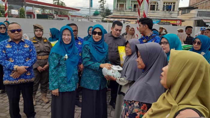 Warga serbu Gelar Pangan Murah Ramadan TP PKK Madina di Pasar Baru Panyabungan. Sedia 5 ton beras dan minyak goreng harga terjangkau untuk bantu kebutuhan warga.