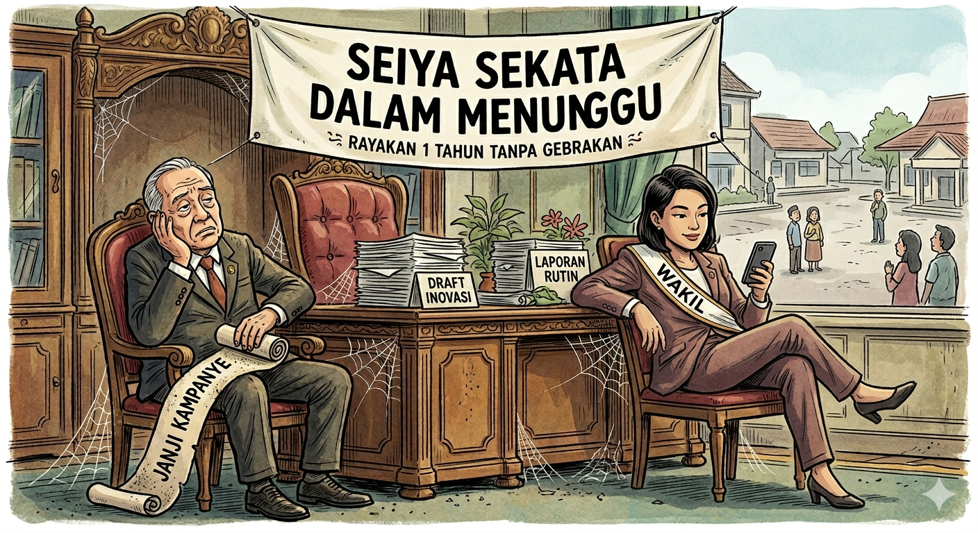 GENAP satu tahun lebih satu hari, momen ulang tahun yang pertama untuk pemerintahan kebanggaan kita. Tidak terasa, sudah setahun masyarakat di kabupaten ini disuguhi pertunjukan “stabilitas” yang luar biasa. Saking stabilnya, kita hampir tidak merasakan ada guncangan inovasi atau gebrakan yang mengganggu ketenangan status quo daerah ini.