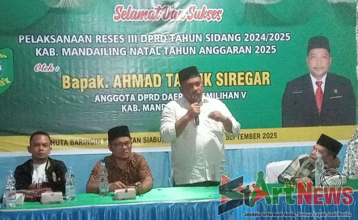 Siabu, StartNews – Ahmad Taufik Siregar menjemput aspirasi konstituennya di Desa Huta Baringin, Kecamatan Siabu, Kabupaten Mandailing Natal (Madina) melalui kegiatan reses yang diadakan di halaman Pondok Pesantren Darul Hadist, Jumat (5/9/2025) malam.